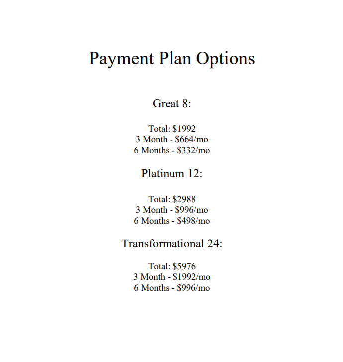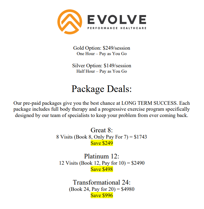 Patients are also much more receptive when they can SEE the offers in front of them. Which is why I also recomend putting all of this information onto a 1 page sheet of paper they can look at. The images below is what I use in my clinic when presenting my programs to new patients: